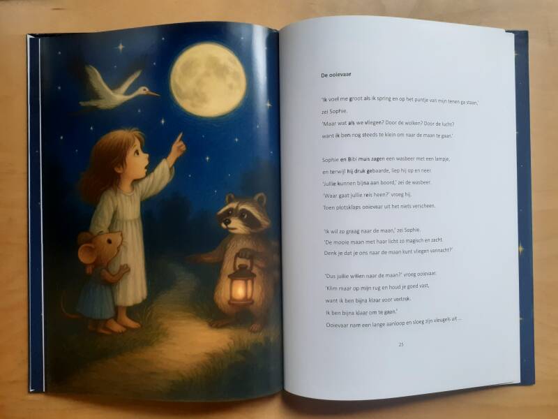 Ik laat je graag een voorbeeldbladzijde zien uit mijn boek Sophie en de Maan. Dit verhaal neemt je mee op een avontuurlijke reis waarin de dromen van Sophie tot leven komen.