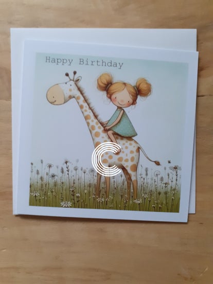Verjaardagskaart voor kinderen met een meisje en een lieve giraffe.