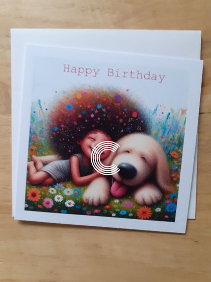 Verjaardagskaart voor kinderen met een meisje en een hond.