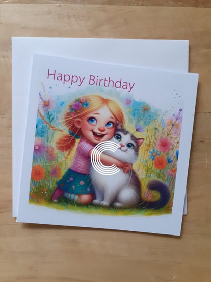 verjaardagskaart voor kinderen met een meisje en een poes.